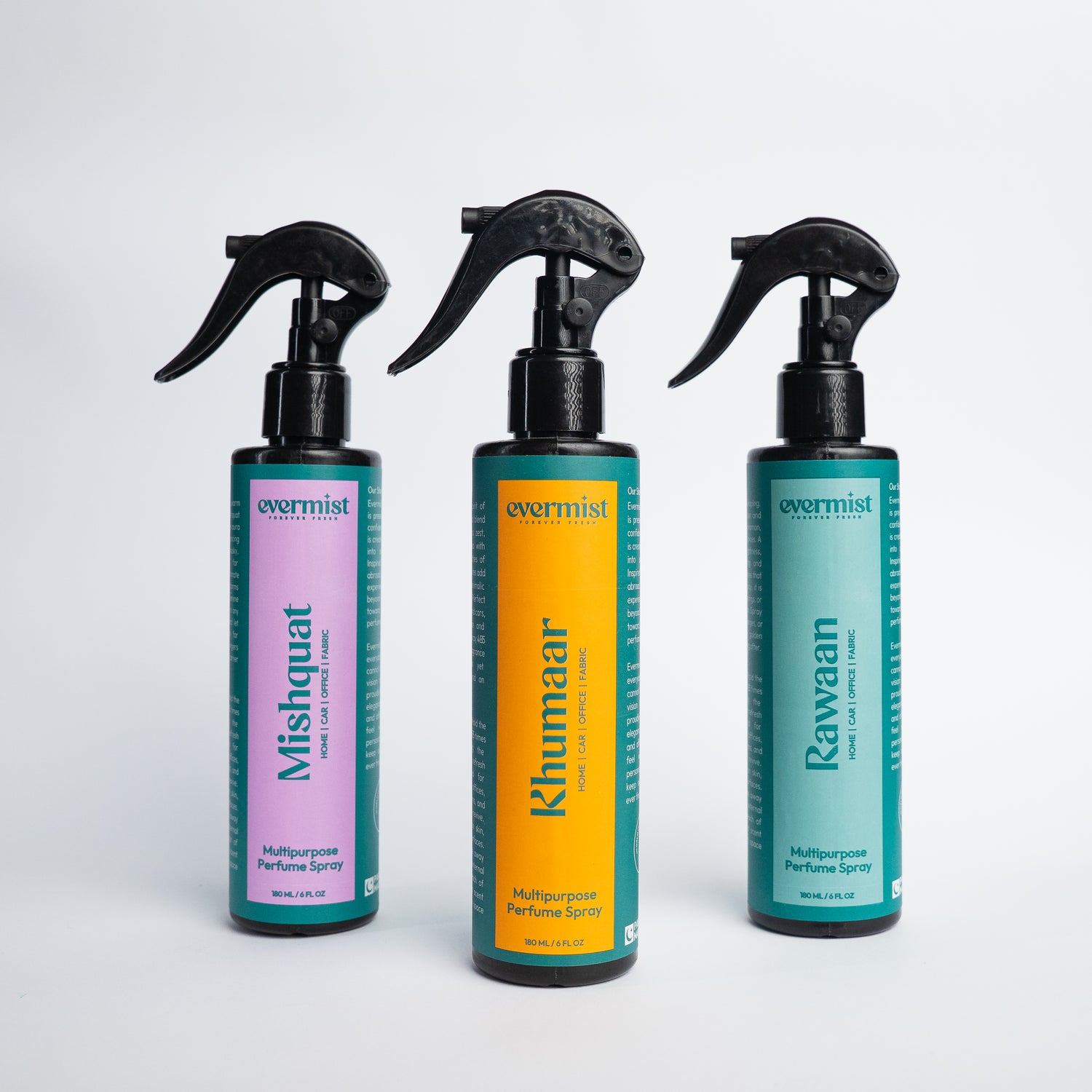 Each Evermist fragrance is crafted as an expression of elegance and mood, transforming everyday spaces into moments of luxury. Our premium collection featuring Mishquat, Khumaar, and Rawaan captures distinct emotions through carefully balanced scent notes. From the warm allure of Mishq to the deep, intoxicating charm of Khumaar and the effortless calm of Rawaan, every mist tells its own story. Hand-poured with precision and artistry, these perfume mists are designed to elevate your surroundings with sophistication that lingers.